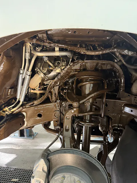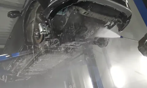 Hjul, innerskjermer og deksler demonteres slik at man sikrer god rengjøring bak disse dekslene. Grundig rengjøring med høytrykk og spesialsåpe brukes for å oppnå et tilfredsstillende resultat. Etter vask foretas en grundig inspeksjon og bilen vaskes om igjen der dette behøves.